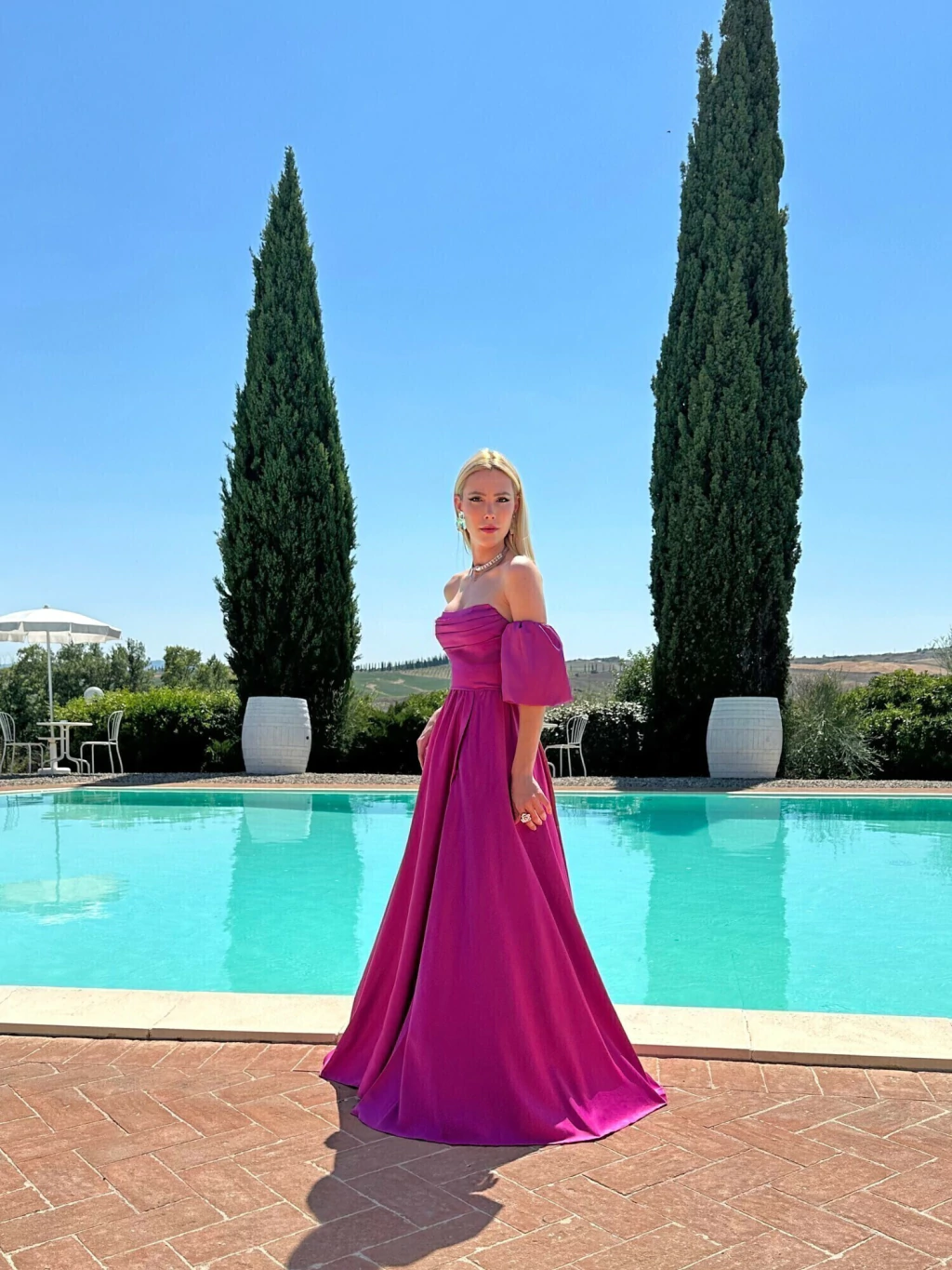 Destaque-se com elegância neste vestido longo em tom Verde Esmeralda. O modelo possui decote tomara que caia, com mangas bufantes removíveis que adicionam um toque romântico e moderno à produção. O busto é estruturado com drapeados sutis, valorizando o colo, enquanto a fenda frontal garante movimento e sensualidade na medida certa. Ideal para eventos especiais, casamentos e festas ao ar livre.